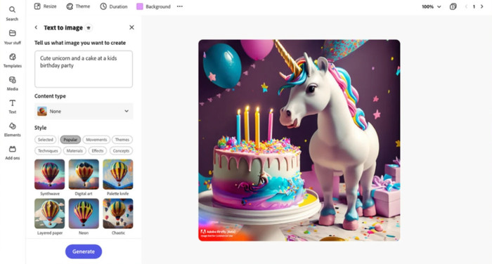 3月底,Firefly生成式AI工具系列的首批两款产品正式进行测试,分别为图像生成和文本效果。第一个图像生成工具能够根据文本提示(prompt)创建图像,如输入“Cute unicorn and a cake at a kids birthday party(可爱的独角兽和蛋糕在孩子们的生日派对上)”,就能迅速生成符合描述的图片,并提供图片风格、样式风格、颜色和色调、灯光等数百种选项对结果进行调整。
