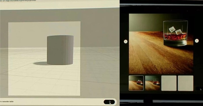 预演使用了一个圆柱体和提示词“威士忌玻璃杯”来展示它的功能,可以看到通过这两个提示,AI立即生成了一幅逼真的影像。你还可以调整图中任何对象的角度和视角,这暗示了firefly对合成图像更高层次的创意控制,允许用户拖放简单的3D形状来确定对象的外观。