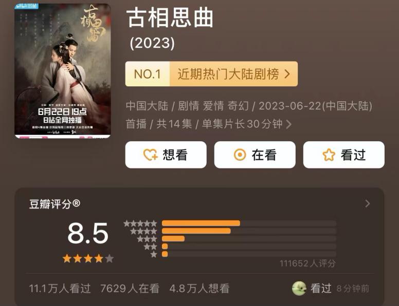 6月在B站播出的14集短剧《古相思曲》拿到豆瓣8.5的高分,以小博大的姿态似乎给古偶剧指明了一条新路。