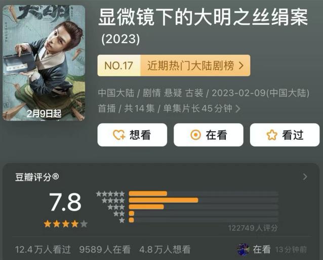 今年年初接档《狂飙》的《显微镜下的大明》虽不是古偶剧,主打悬疑与历史,也挑战了14集的短集数。其中的主演张若昀、王阳、戚薇、费启明都是年轻观众所熟悉的演员,该剧在不靠强情节和强情感浓度的情况下拿到了豆瓣7.8分,后来又被北京卫视购入播出。尽管播出期间存在慢热现象,但回头看来,《显微镜下的大明》在2月网络热度值仅次于《狂飙》,证明还未广泛普及的古装短剧大有可为。
