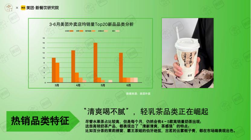 产品层面,霸王茶姬避开喜茶掀起的水果茶大战,回到“奶茶”领域做文章。据上文提及的《报告》数据,尽管水果茶在热销产品中占据大半,但每个月仍会有4-5款高销量奶茶出现,其中“清新清爽、茶感强”的产品更具优势。