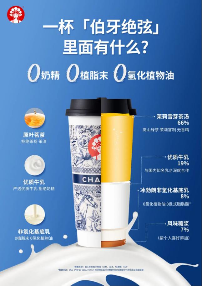 霸王茶姬的大单品“伯牙绝弦”就完全属于这一品类。仅由茶汤、牛乳、非氢化基底乳和糖浆构成,后两者还可以去掉,其余主推SKU也大多基于这一逻辑开发,仅保留个别水果茶、雪顶茶、冷泡茶产品作为防御和补充。目前,“伯牙绝弦”已经售出超过2000万杯。