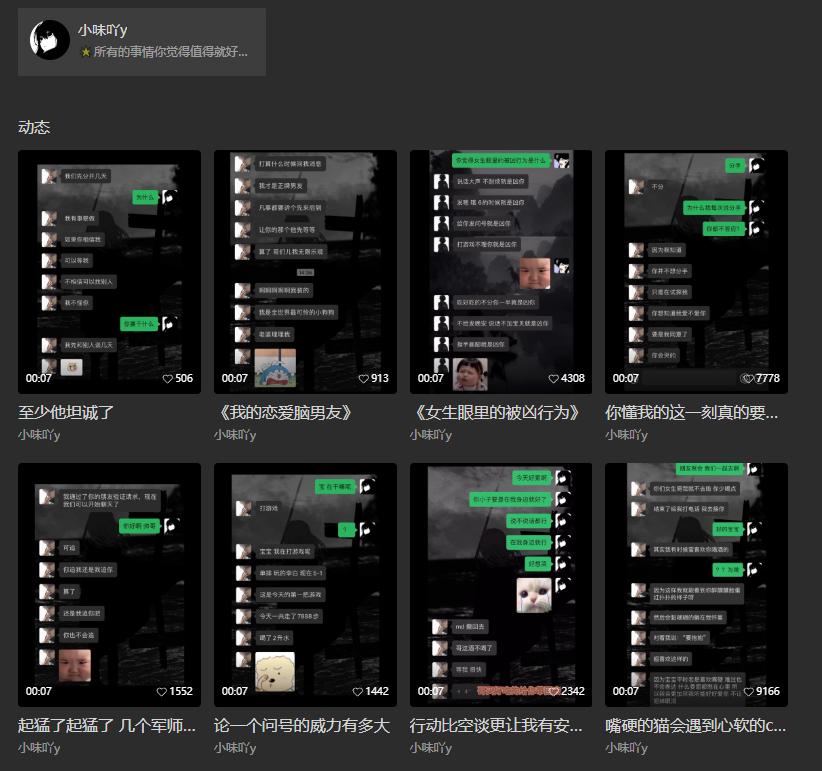 在@小味吖y的聊天视频里,我们会发现并没有多么深奥的理论,就像是平常的小情侣之间的一些有趣互动,或者称之为情感废话文学。