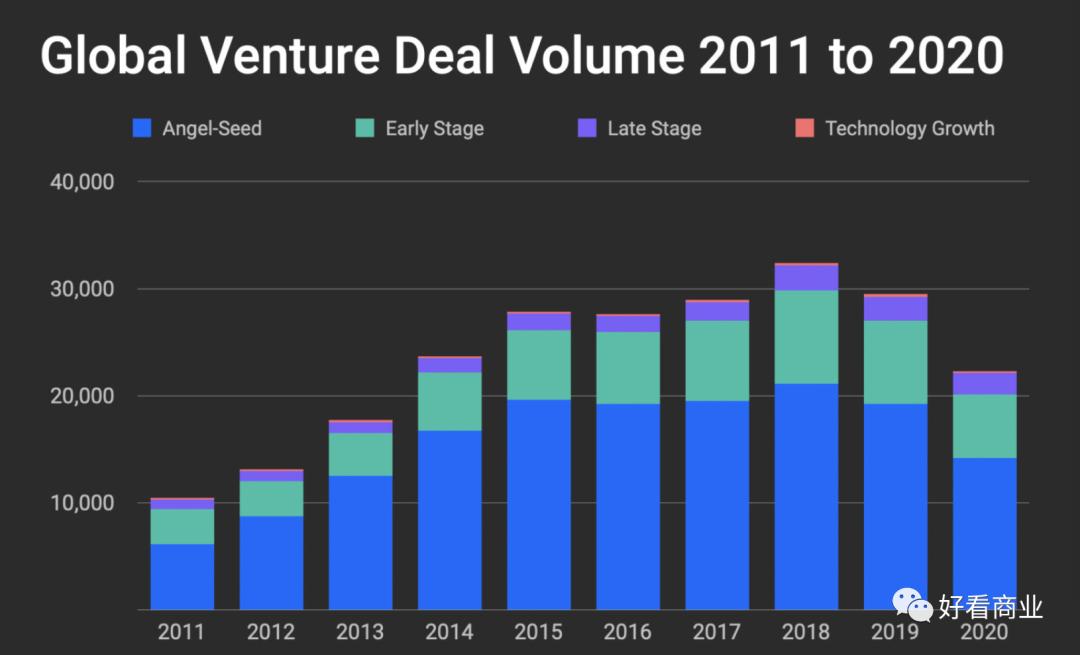 Crunchbase数据显示,2020年,全球风险投资同比增长4%,达到3,000亿美元;2011年时,总规模不足1000亿美金。