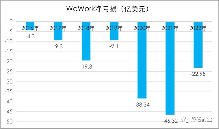 持续亏损是WeWork的常态,甚至可以说,它成立至今,盈利是不存在的。从披露过的数据看,2016-2022年,它共亏损了149.6亿美元。