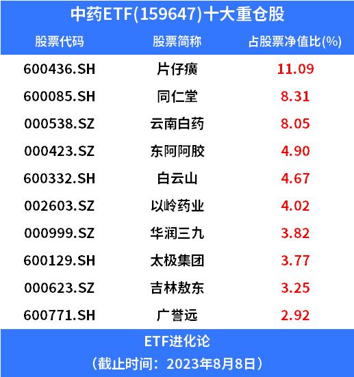 中药ETF(159647)密切追踪中证中药指数,前十大重仓股包括片仔癀、云南白药、同仁堂等为老字号中药企业。如果看好,不妨多关注。