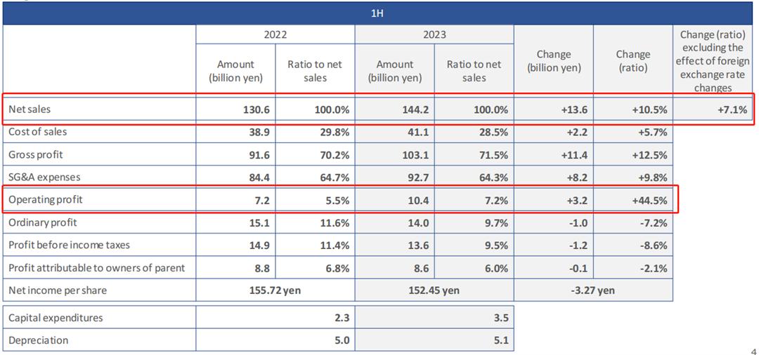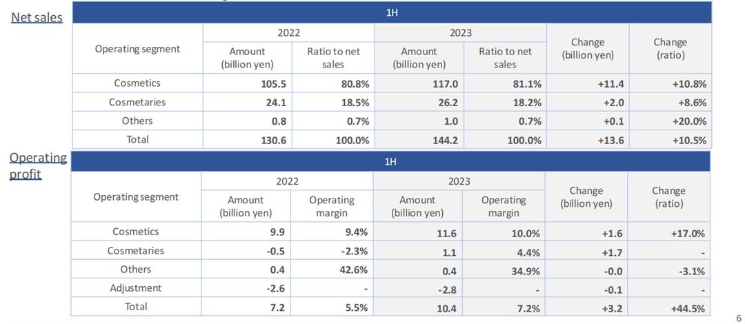 拆分到业务板块上,化妆品事业部门2023财年销售额预计为2498亿日元(约合人民币126.2亿元),同比增长6.3%;美容事业部门2023财年销售额预计为532亿日元(约合人民币16.88亿元),同比增长1.8%;其他部门2023年销售额预计同比增长3.4%。