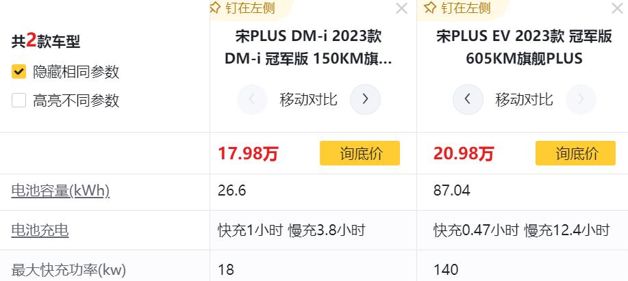 宋 PLUS EV 电池有 87 度,宋 PLUS DM-i 只有 26 度,但是 EV 版因为快充功率大, 0.47 小时就能充满,而 DM-i 则需要 1 个小时。