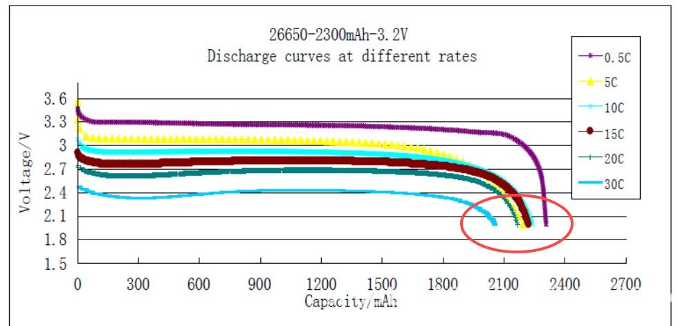 拿下面对比图就能看出,同等条件下,倍率越大的电池,实际能使用的电量越小。