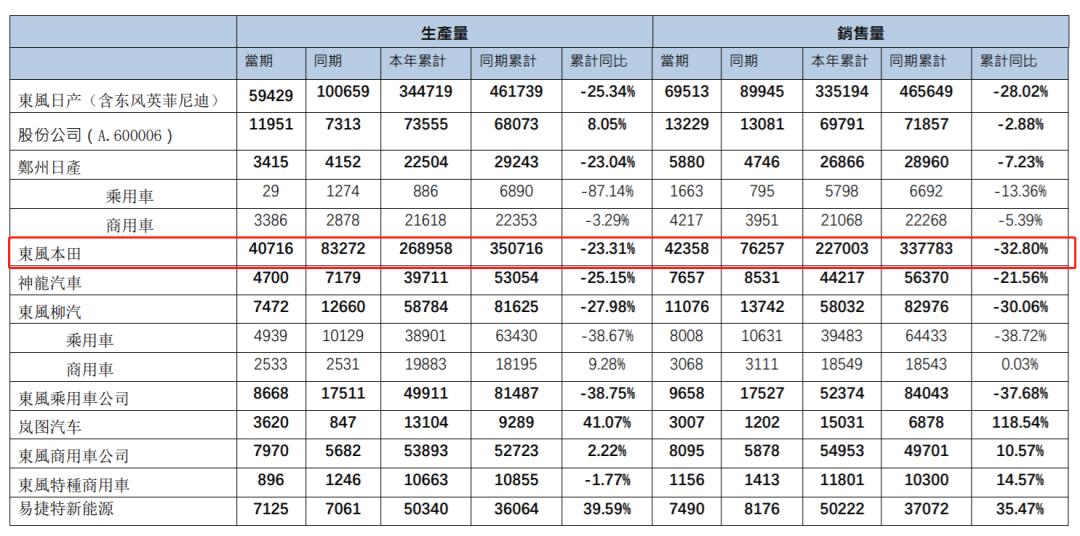 今年6月,本田中国的终端汽车销量为113133辆,同比下滑19.8%;今年1-6月,本田中国的终端汽车累计销量为529691辆,同比下滑22%。