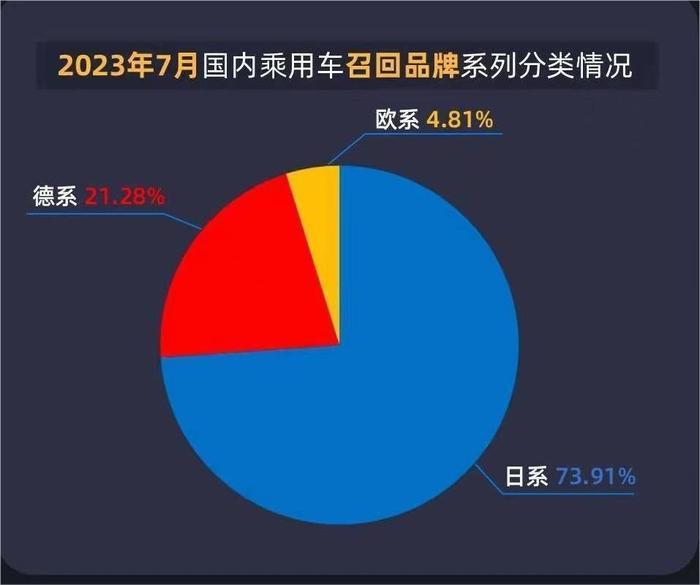 2023年7月,国家市场监管总局发布的国内乘用车召回公告相关情况,日系车超过召回总量的七成,其中日产、本田、丰田、雷克萨斯等品牌共计召回11.47万辆,占本月召回总量的73.91%。