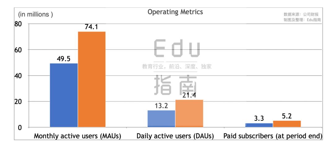 在运营数据上,Duolingo公司本季度月活用户数为7410万人,上一财年同期为4950万,本季度月活增长50%。该公司季度日活为2140万,上一财年同期为1320万,本季度日活同比增长62%。其截至本季度末的付费订阅用户为520万人次,上一财年同期为330万,本季度该项增幅为59%。