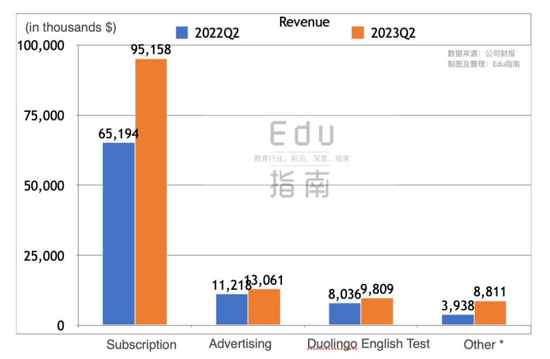 Duolingo公司收入来自订阅、广告、Duolingo英语测试、其他业务四分部。其中本季度订阅收入为9516万美元,上一财年Q2该项收入为6519万美元,本季度同比增长46%。广告收入本季度为1306万美元,上一财年Q2为1122万美元,本季度同比增长16%。Duolingo英语测试业务季度收入为981万美元,上一财年同期为804万美元,该项收入同比增长22%。包括App应用内虚拟商品的其他收入本季度收入为881万美元,上一财年同期为394万美元,该项收入增长大于100%。