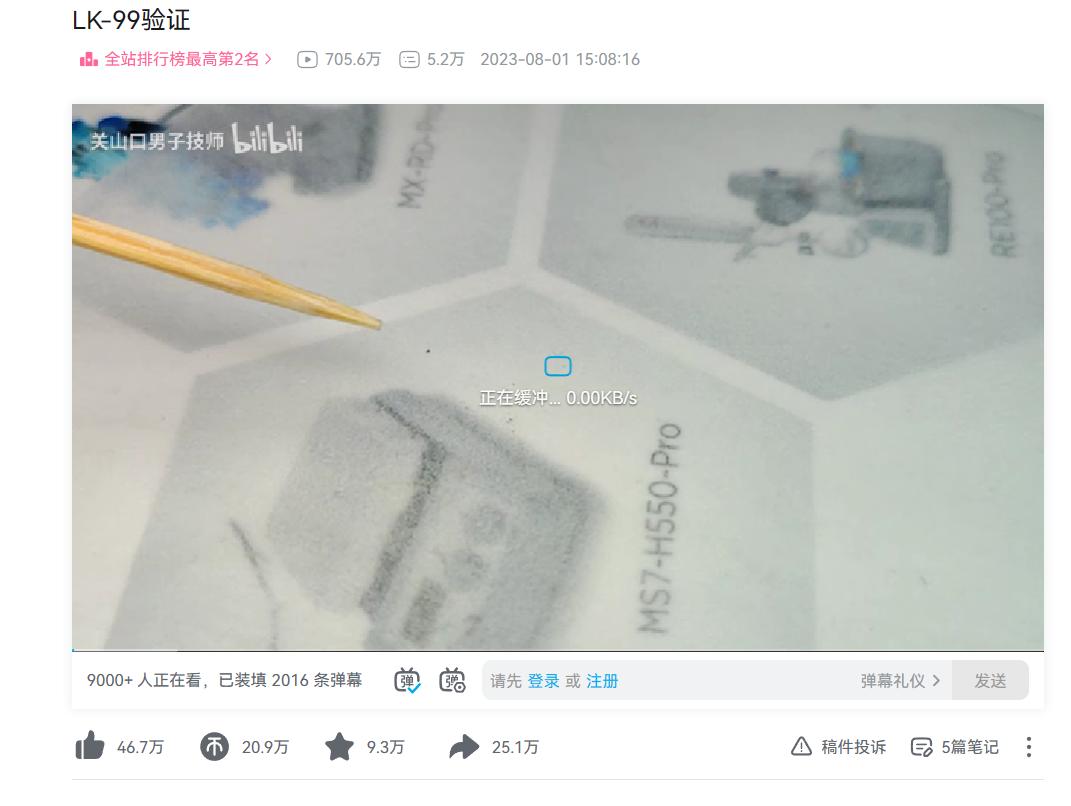 另据视频资料介绍,该实验是由华中科技大学材料学院博士后武浩、博士生杨丽,在常海欣教授的指导下,成功首次验证合成了可以磁悬浮的LK-99晶体,该晶体悬浮的角度比Sukbae Lee等人获得的样品磁悬浮角度更大,有望实现真正意义的无接触超导磁悬浮。目前该视频的播放量已经雄踞B站全站排行榜第2名,相关评论已经超过五万。