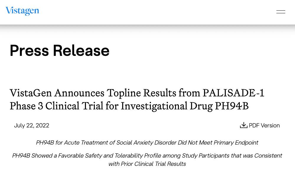 2023 年 8 月 7 日,PH94B 研发公司 Vistagen 宣布其 PALISADE-2 临床试验取得了积极的结果。