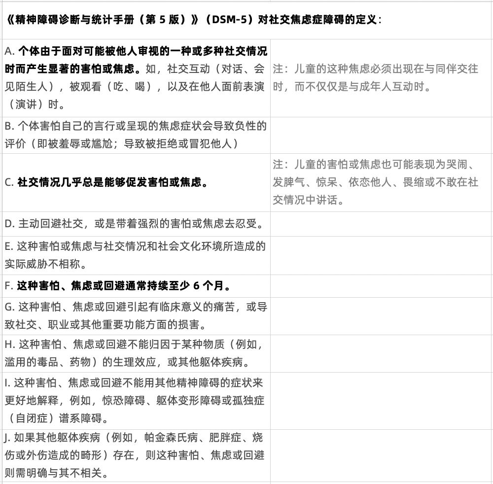 在美国精神病学会 DSM-5 中,对社交焦虑障碍(Social Anxiety Disorder,SAD)的定义包括:-个体由于面对可能被他人审视的一种或多种社交情况时而产生显著的害怕或焦虑;-社交情况几乎总是能够促发害怕或焦虑;
