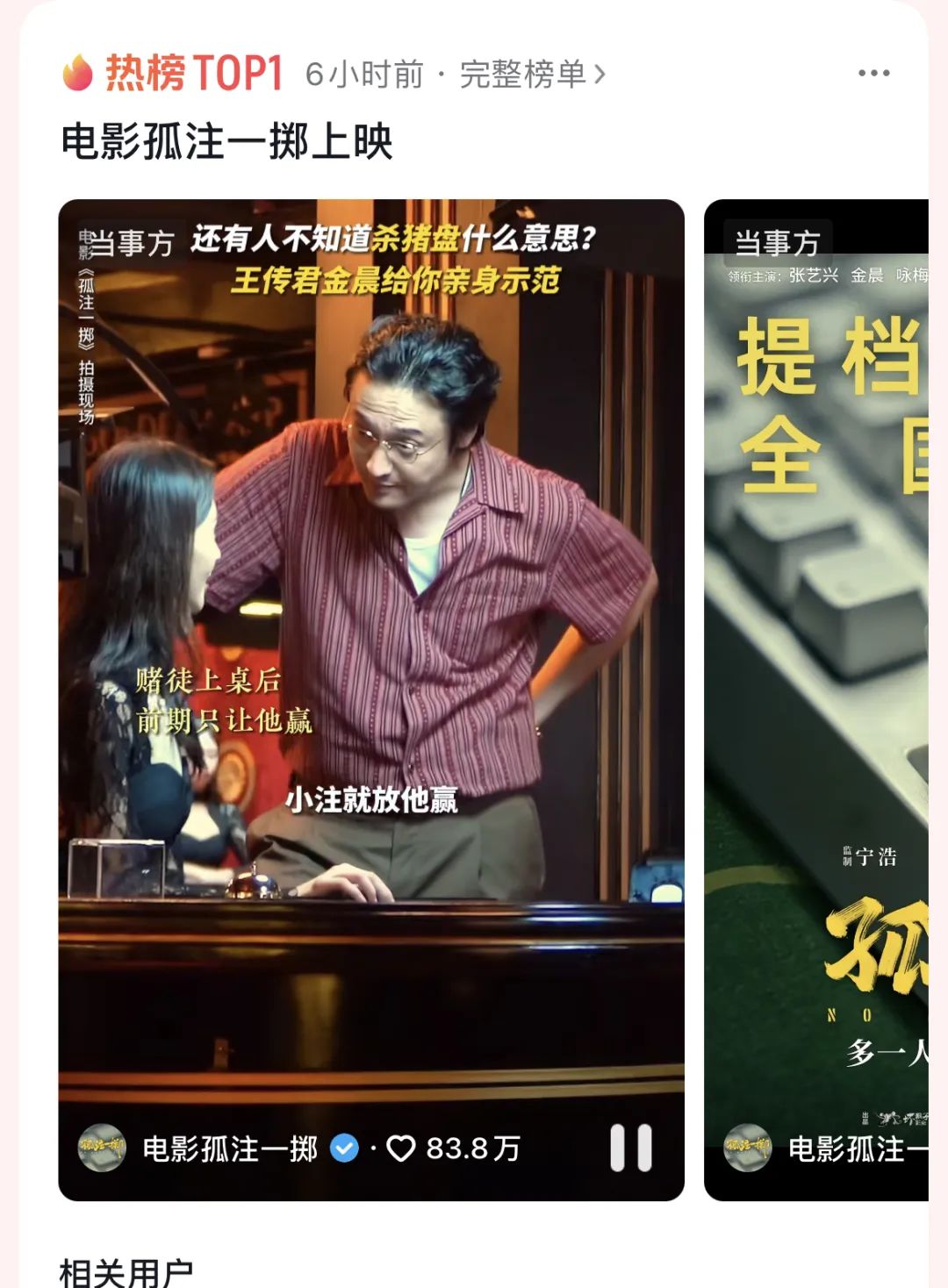 也有长期铺垫上映见分晓的——周末刚刚开启点映的《孤注一掷》,在抖音上已经营销了将近两个月有余,对应的营销点已经从金晨的性感荷官在线发牌,进化到抖音用户主动模仿电影中王传君拜菩萨了。
