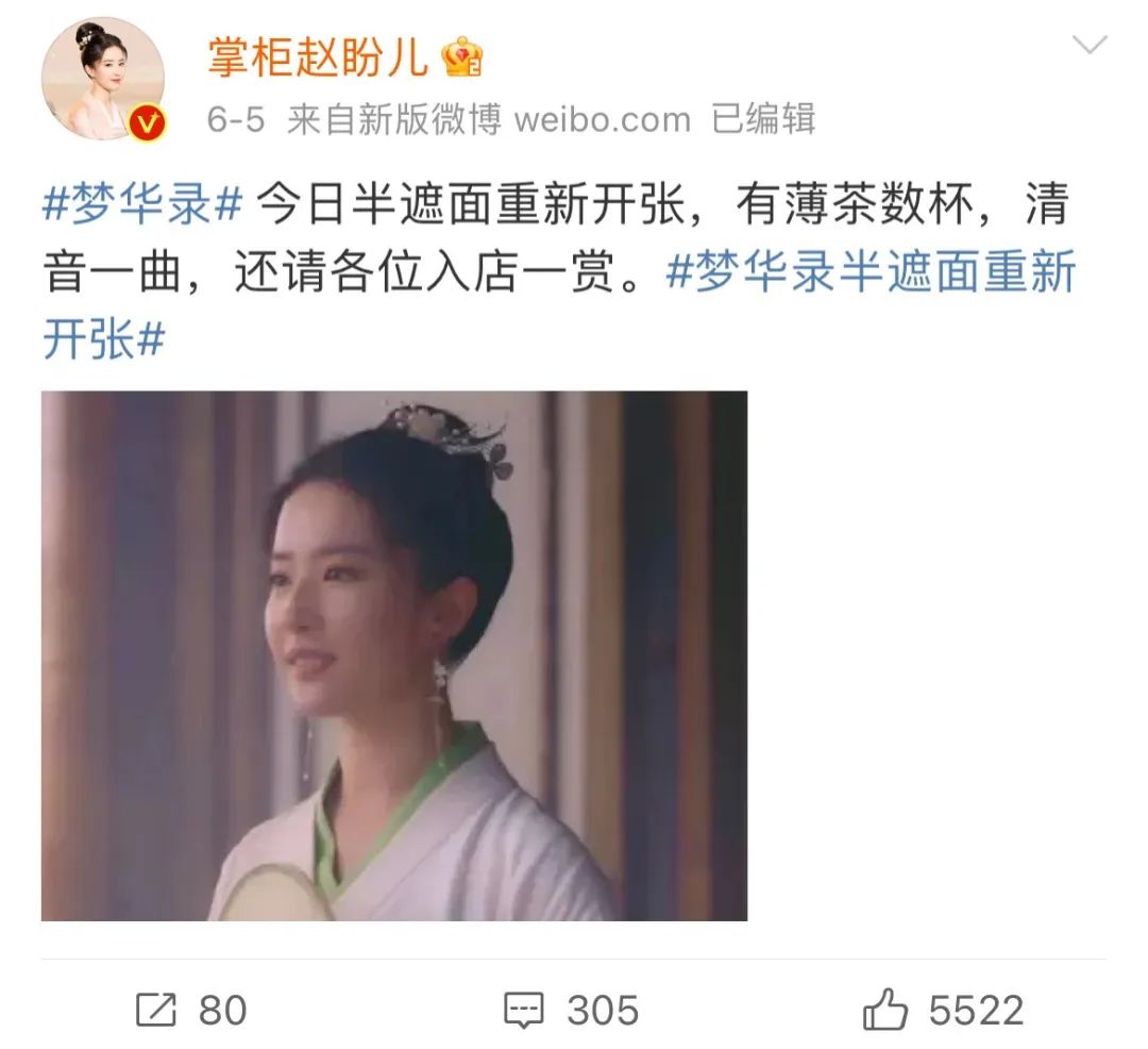 《梦华录》在上线播出之前,就创立了@掌柜赵盼儿 @皇城司顾千帆 @厨娘孙三娘 @琵琶名手宋引章 @探花欧阳旭 @梦华录半遮面多个角色的微博账号,一方面是预热开播在即;一方面也是为角色账号营销做铺垫。待剧集播出时,角色账号会根据剧情的发展发表相关的原创微博。