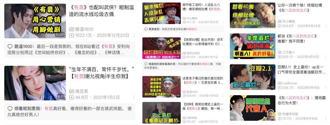 而被影视区UP主集体恶评,又称为“团建”,则难逃“烂剧”的标签,《新鹿鼎记》《有翡》乃至《东八区的先生们》都曾深深地体会到如此“群嘲”。譬如:早期靠着“辛辣毒舌”烂剧秒评风格走红的老邪、路温、三代鹿人、开心嘴炮等一批UP主,便成功吃到了不少影视剧的红利。