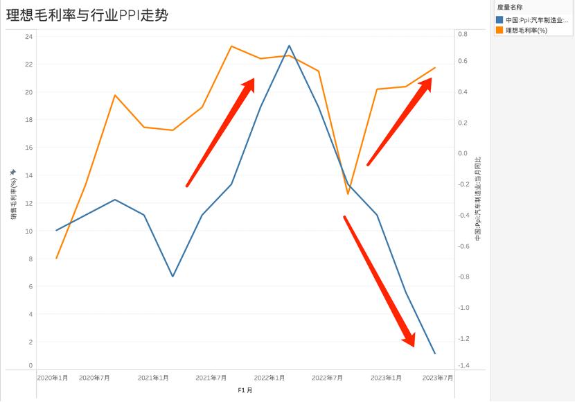 带着上述分析框架,我们再看理想汽车与行业PPI的表现。作为汽车行业后起之秀,理想在创业之初是无法规避行业“系统风险”的,在上图中最初理想的毛利率与行业PPI也呈现强互动关系,直到2023年之后两条折线走势开始分化,理想毛利率仍处于修复期而行业PPI已经急转直下了。