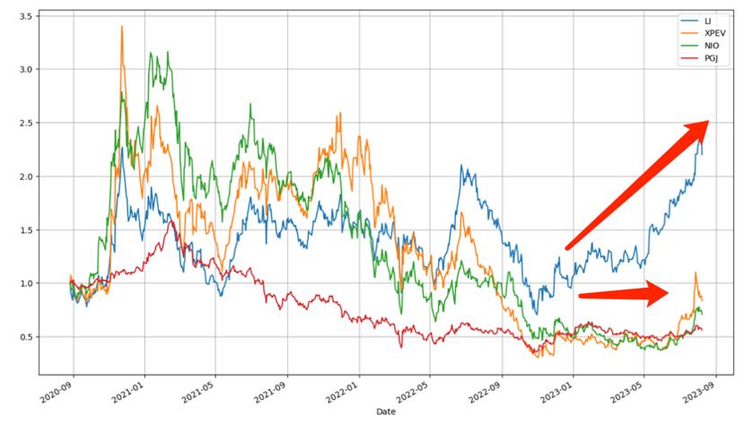 我们首先整理了造车新势力(蔚来,理想,小鹏)和金龙指数自2020年9月至今的股价涨跌情况(起点设为“1”),见下图: