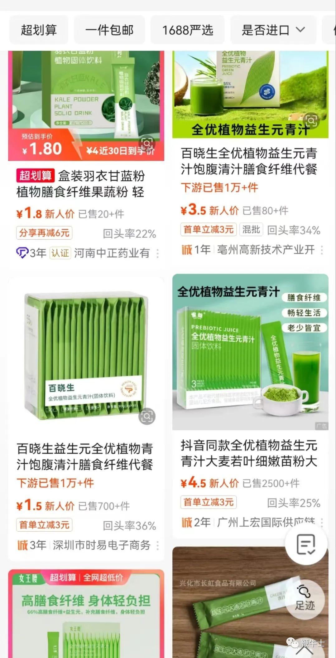 此外,在抖音上售价99元、149元、168元的青汁,在1688上普遍单盒售价不超过5块钱,且批发的数量越多价格越便宜。
