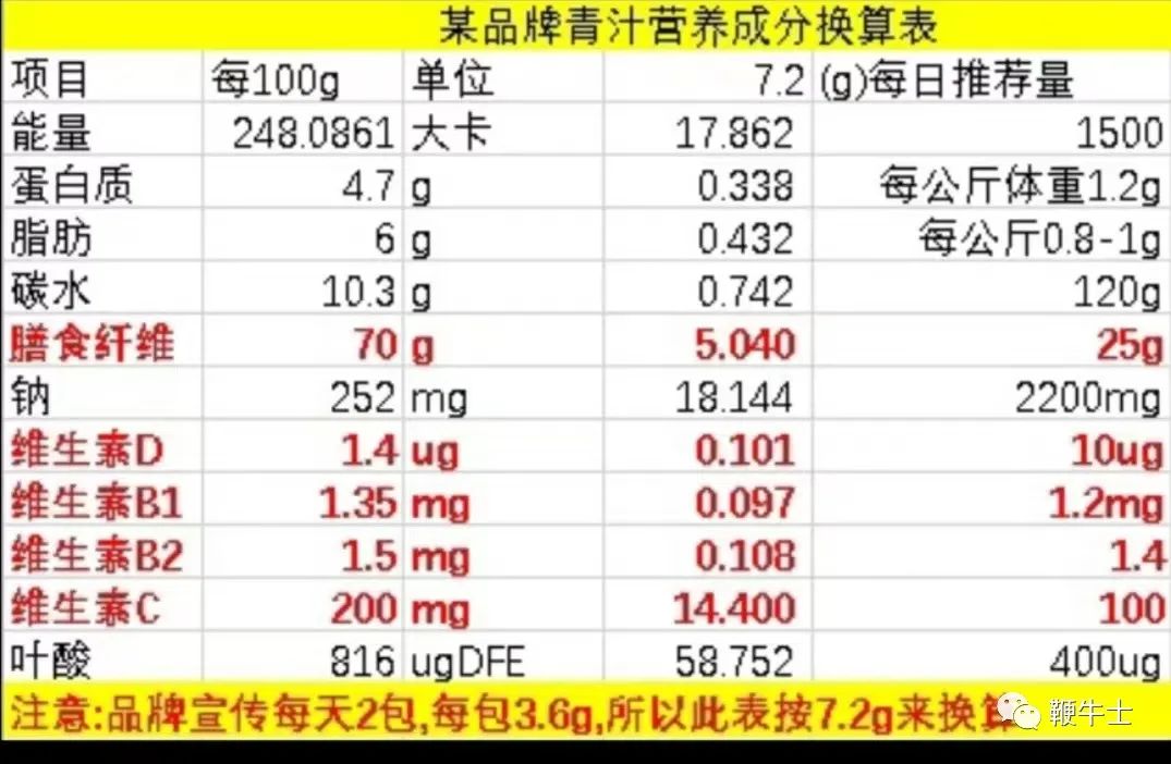 有网友制作出某品牌青汁营养成分换算表,不难看出2袋青汁所含的各种营养成分远低于每日推荐量。