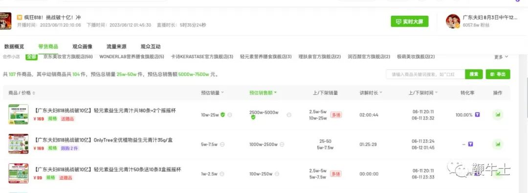 在此前的618期间,广东夫妇也曾带货多款青汁品牌,且均取得不错的成绩,销售额最低也超过百万,最高一款达到2500万-5000万。