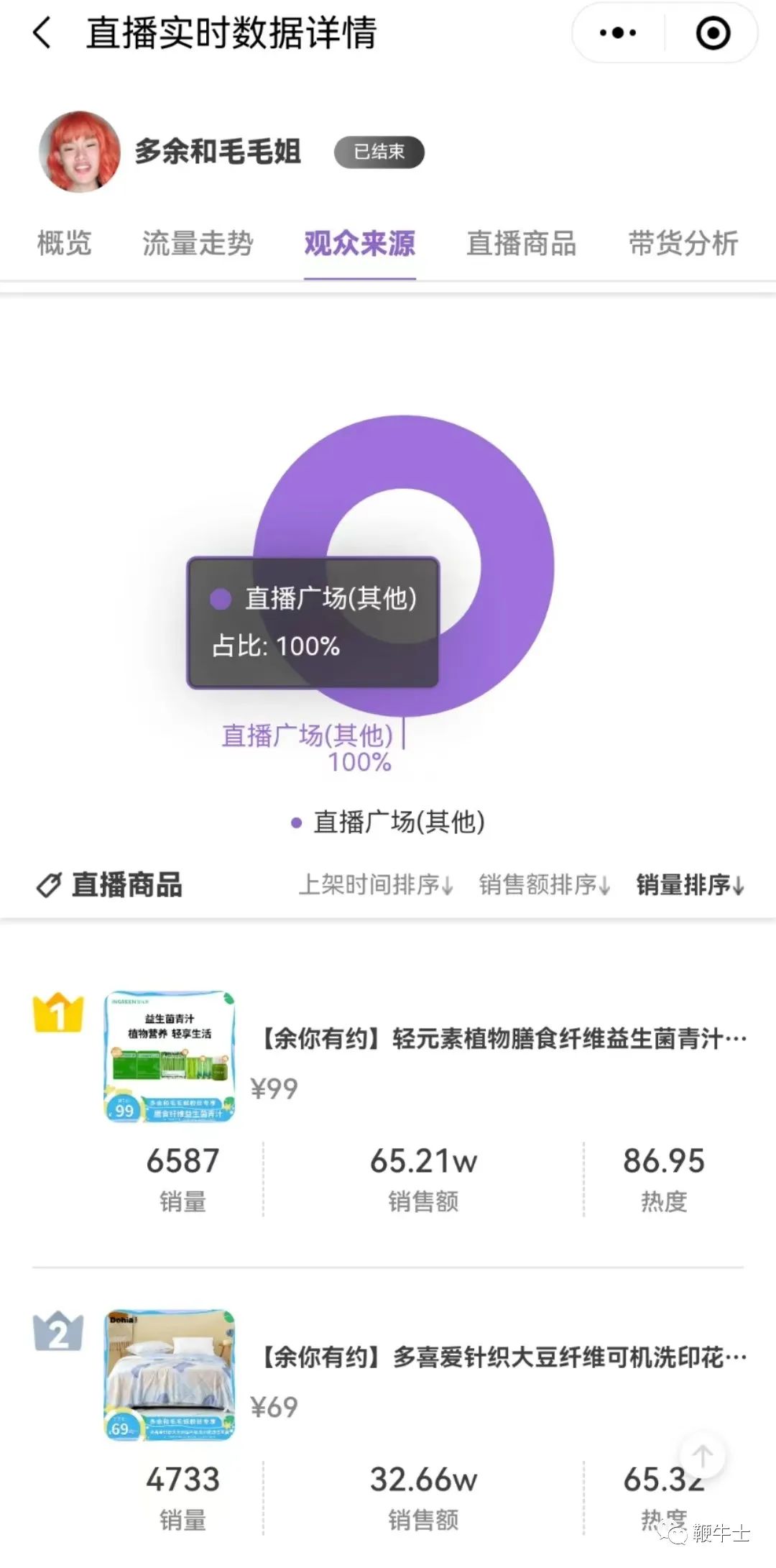 在抖音千万粉丝网红多余和毛毛姐近一个月的直播里,几乎每场直播都上架了青汁产品,且为固定品牌。