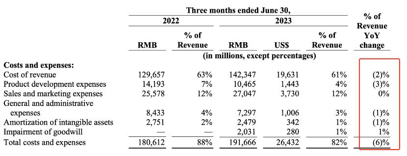 当扩张雄心不再,对内花钱也越加谨慎,本季度几乎所有期间费用都呈收缩态势,改善了经营性利润率6个百分点。