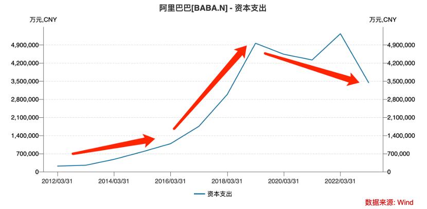 阿里赴美IPO之后,资本支出便扶摇直上,一方面阿里主营业务开始由最早的电商向外延伸到云计算,大文娱,其后又加入线下零售以及本地生活等业务,每个部分都是用资金搭建而成。