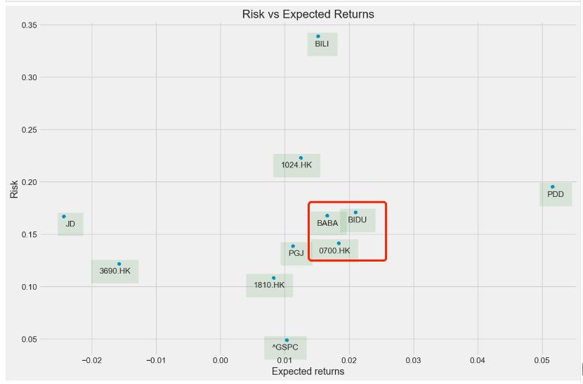 上图中风险为股价波动标准差(一月为窗口期),预期收益为每日股价收益平均值。在上图可以看到BAT三家企业基本处在同一区间,也说明市场对此前巨头企业的观感是一致的,而在全球大放水备受追捧的B站在此周期是被边缘化的(高风险低收益),市场虽然不时时刻刻有效,但在整体上还是可以反馈其一定周期偏爱的;