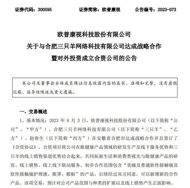 根据欧普康视的公告显示,与疯狂小杨哥新成立的合资项目,是将“公司在眼健康产品领域的研发生产及线下服务优势和三只羊的线上销售渠道优势结合起来,共同拓展生活和消费类视光与眼健康产品的研发、线上销售、线上线下联动服务”。
