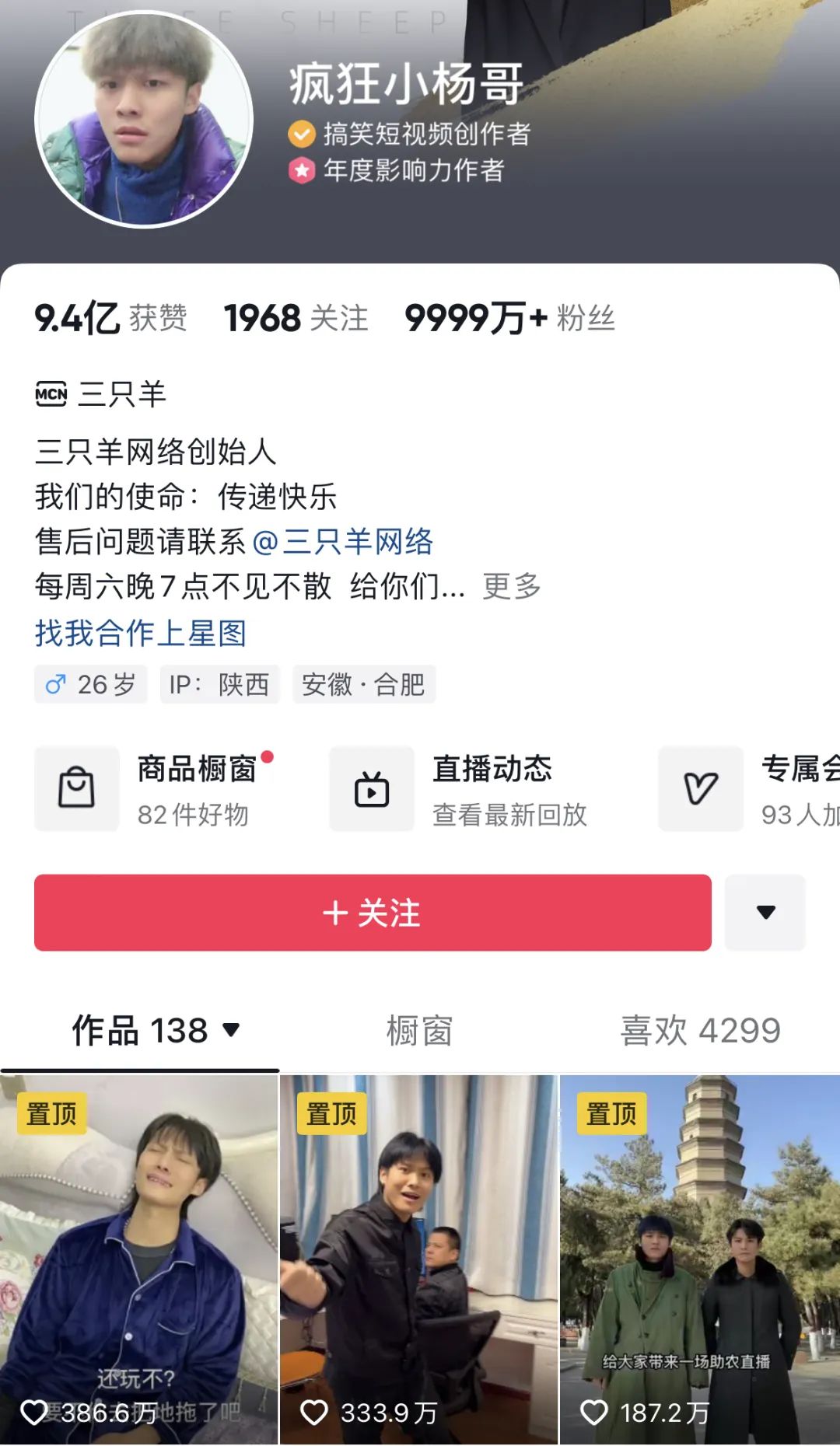 坐拥全网近2亿粉丝的疯狂小杨哥,早期以搞笑视频走红网络,后来转型直播带货之后仍旧保持着鲜明的草根风格,其直播时夸张的语言动作,虽然赢得了不少年轻粉丝的喜爱,但在有些观众看来,则显得太过聒噪和浮夸。
