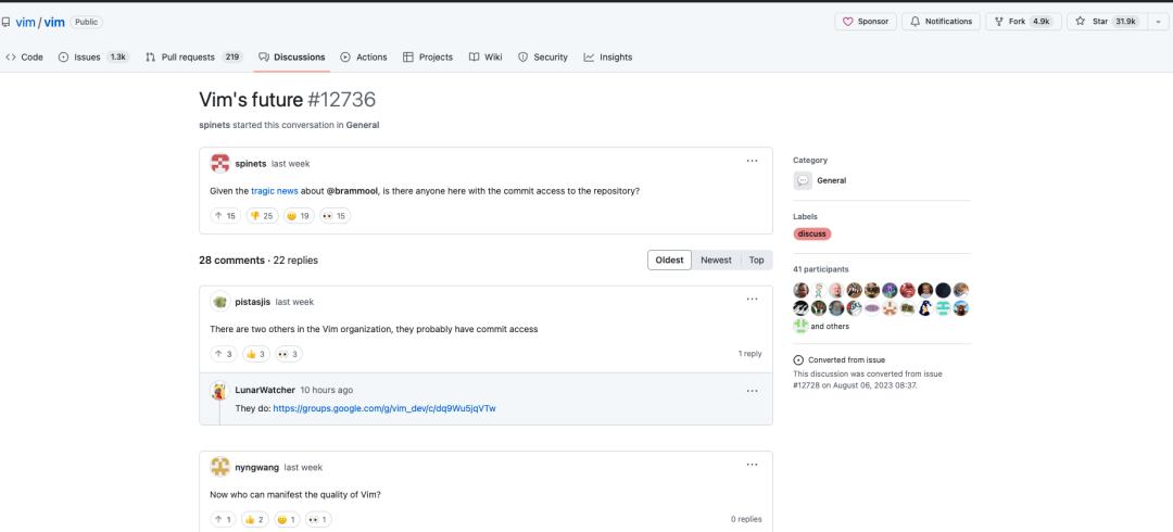 他的离开给项目留下了巨大的空白。对于 Vim 的下一步,该如何走?在 GitHub 上的 Vim 项目 Discussions 页面中(https://github.com/vim/vim/discussions/12736),有网友讨论: