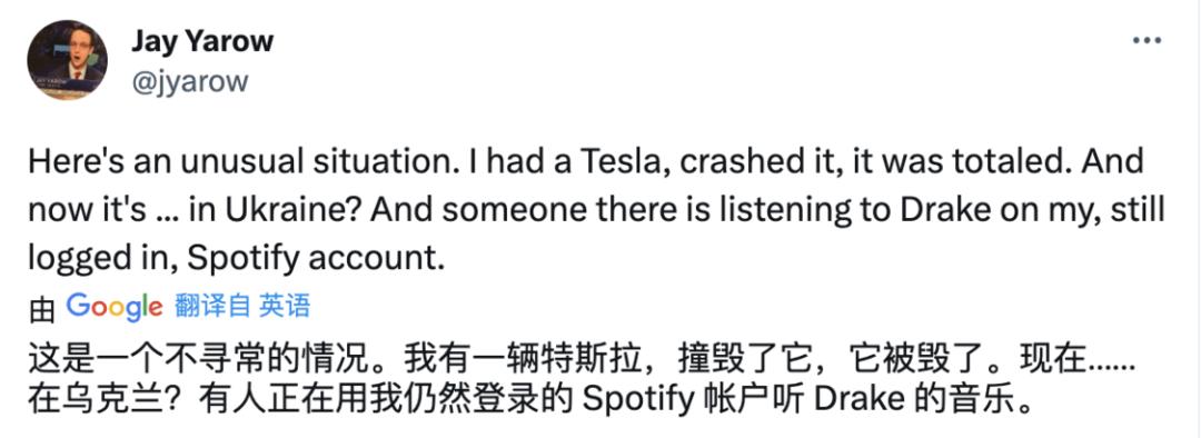 据这辆车的前车主、CNBC执行编辑杰伊·亚罗(Jay Yarow)透露,他打开了自己的特斯拉应用,使用地理定位功能,发现这辆车或者说它的计算机突然在饱受战争摧残的乌克兰南部地区联网了。他还发现,这辆汽车在乌克兰的新主人正利用他未解除绑定的Spotify应用账户,收听他为说唱歌手德雷克(Drake)建立的电台播放列表。