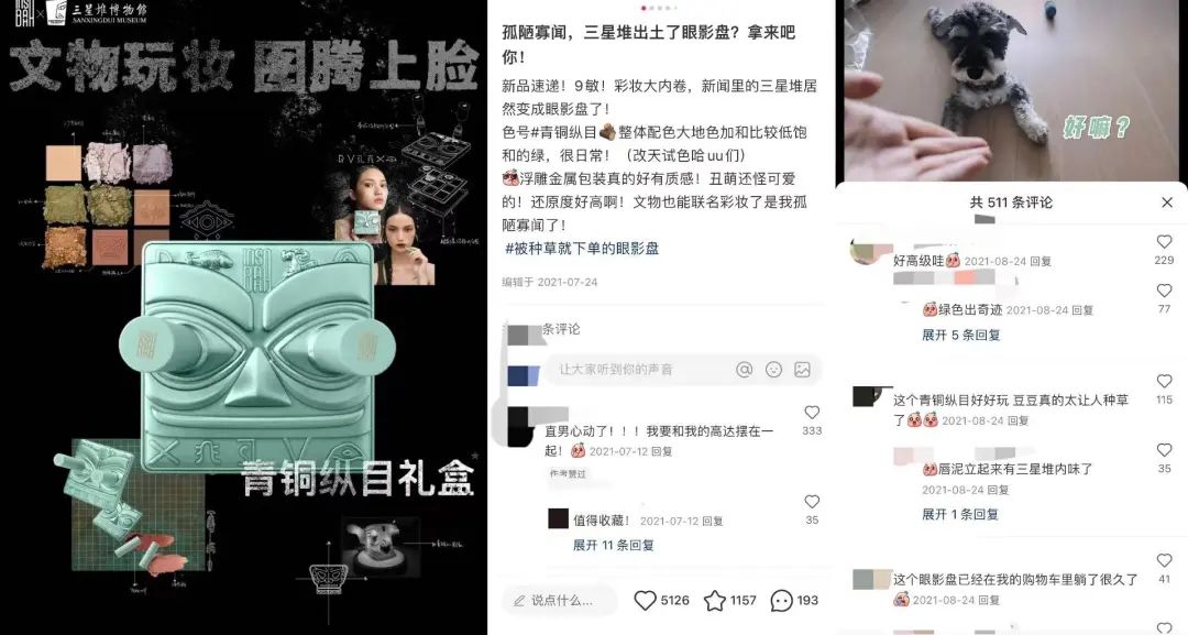 另外,在2021年,还有一出圈美妆联名营销案例,即三星堆和INSBAHA原色波塔联名推出系列彩妆。唇釉可以依靠吸铁石吸附在眼影上,基本还原三星堆的造型,凭借着“出众”的外观,该联名事件迅速在网上引发热议。不少网友表示“好好玩、有意思”,甚至有男性用户表示:“要买来和高达摆在一起。”