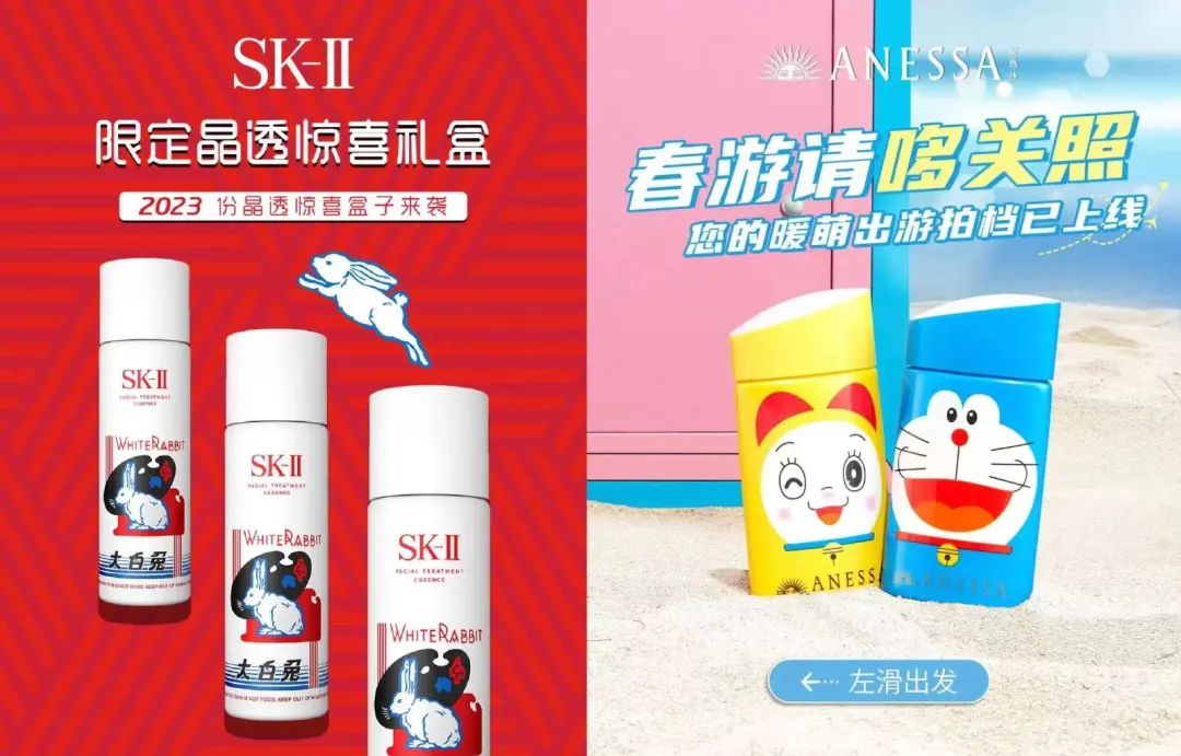 在目前市场上产品趋于同质化竞争的情境下,美妆品牌联名知名IP在一定程度上可以为其卖了多年的产品注入新的活力,从而形成差异化。比如,SK-II神仙水采用大白兔的图案包装,安热沙采用哆啦A梦的图案进行包装,外观上的新颖也能吸引一部分消费者。