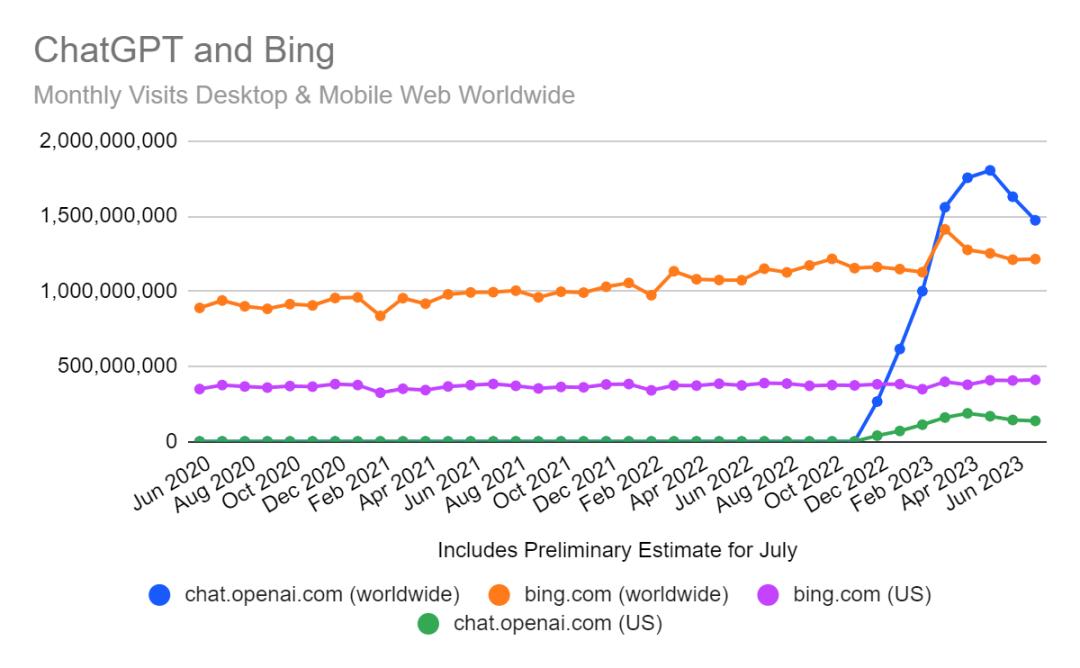 继 6 月流量首次下降了 9.7% 后,根据网站数据分析工具 SimilarWeb 最新调查显示,ChatGPT 出现了连续第二个月的下降:7 月其流量又下降了 9.6%。