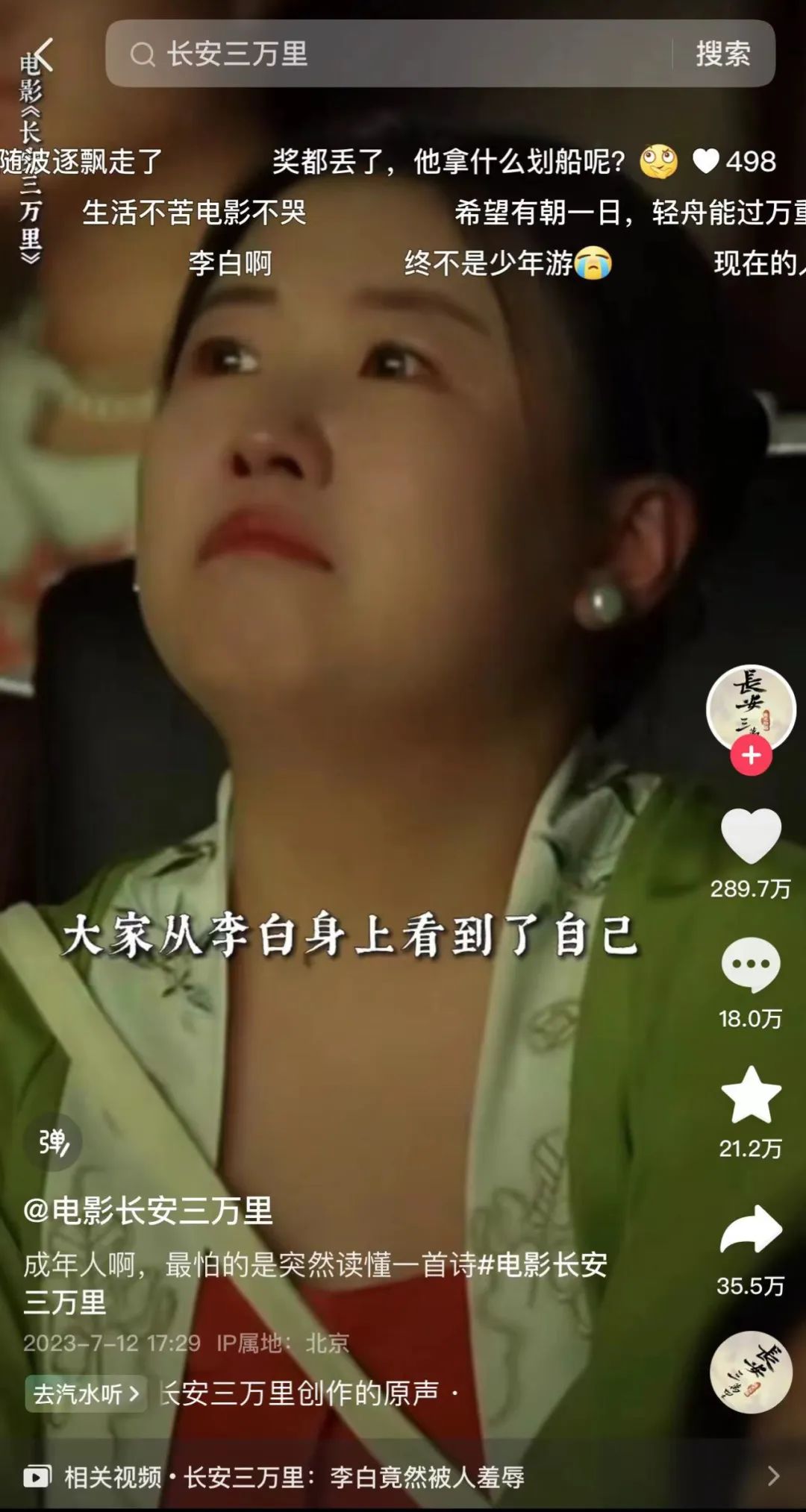 在影片上映中期,随着观影群体的持续扩大,有不少中年观众都透过影片中的诗人经历产生共情。影片中对李白郁郁不得志的表现,让人们熟知的“轻舟已过万重山”跃出文字化为一段鲜活境遇,更让这句经典诗句延伸为一句流行语。