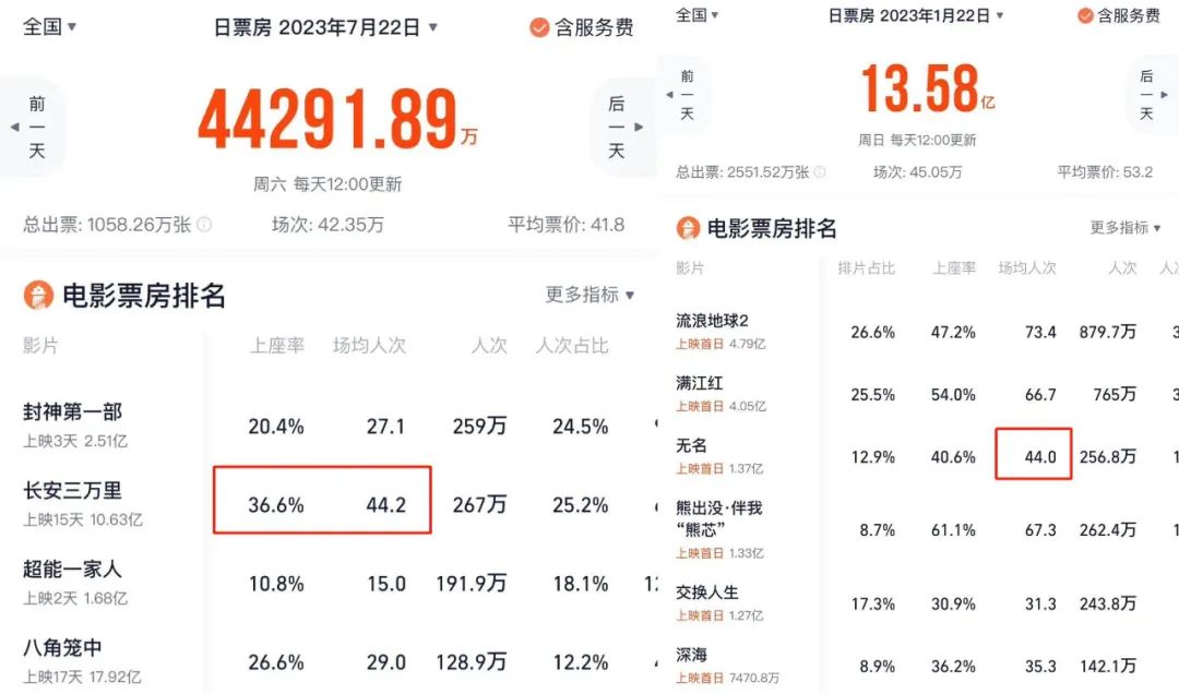 《长安三万里》的上座率有多好?打个比方,以出现上座率峰值36.6%的7月22日这一天为例,该片的场均人次达到了44人,类比竞争最为激烈的今年春节档大年初一,这个成绩都足够排到第三位。