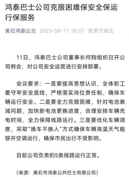 8月11日傍晚,黄石鸿泰微信公众号发文表示,公司董事长何翔组织召开公司例会,对公司安全运营进行安排部署。其中提到了多方面举措,例如针对电池衰减问题,加快新电池更换进度,合理安排车辆充电时间,全力保障线路运行,优化车辆调度,采取“换车不换人”方式确保车辆高温天气能够开空调运行等。