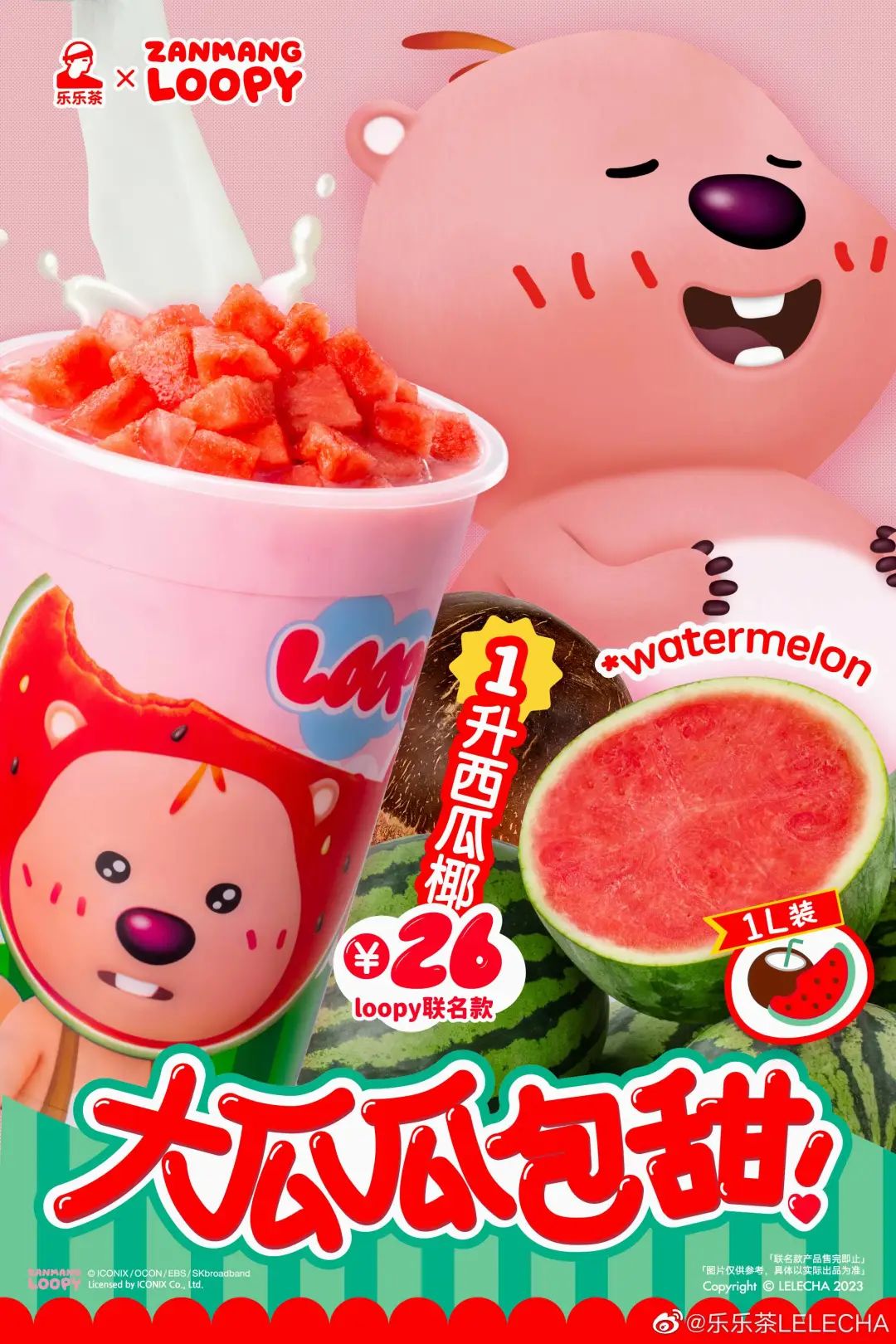 乐乐茶最近大概是放大招了,前有「打工人」表情包新品,后有主动和 Loopy 合作推出西瓜椰。
