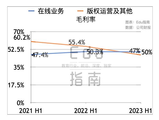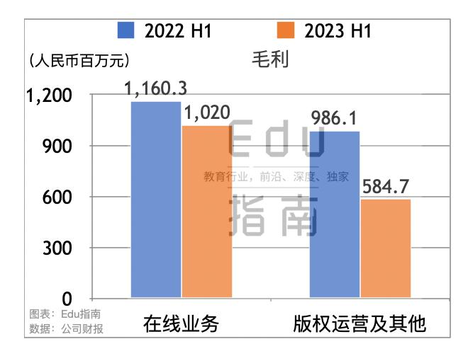 其中2023年上半年在线业务毛利为10.2亿元,同比上一财年同期的11.6亿元,该项毛利减少12% 版权运营及其他业务本财年中期毛利为5.8亿元,上一财年同期为9.9亿元,本期毛利同比减少41%。