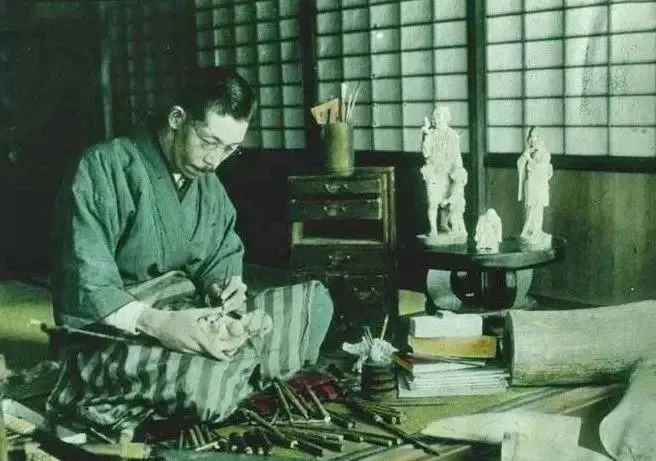 20世纪初,一位金刚组的匠人正在专心雕刻木制塑像