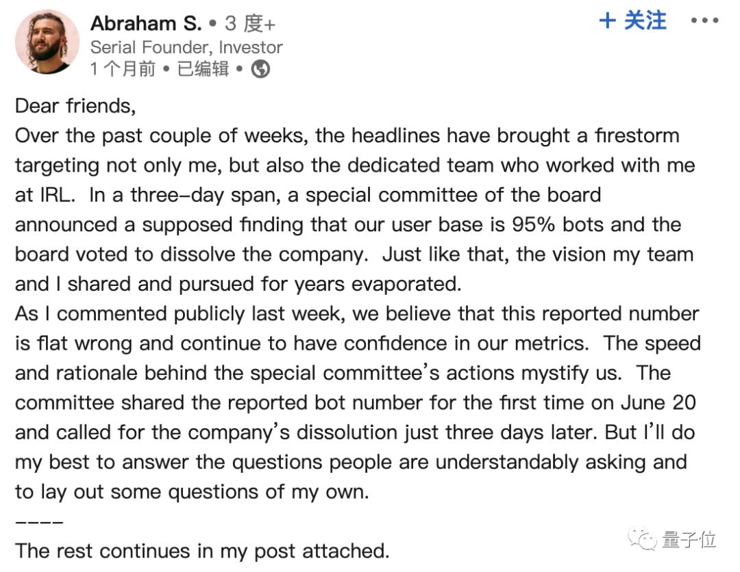 另外,其实在去年7月就有媒体报道IRL内部在进行调查。但在调查近一年后,在没有任何具体说明的情况下得出95%用户是机器人的结论,董事会也随即马上关闭公司,并清算剩余资本。