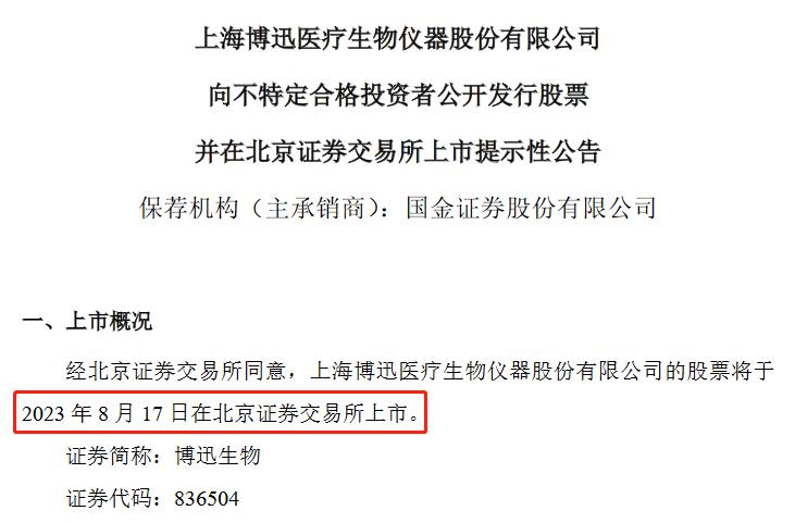 博迅生物(836504)将于8月17日在北交所上市,同日从新三板摘牌。据介绍,公司深耕于实验室设备及生命科学仪器行业,产品广泛应用于恒瑞医药、清华大学、贵州茅台、蒙牛等,2023年上半年公司营收、净利润双增长,其中净利润增速达到82%。