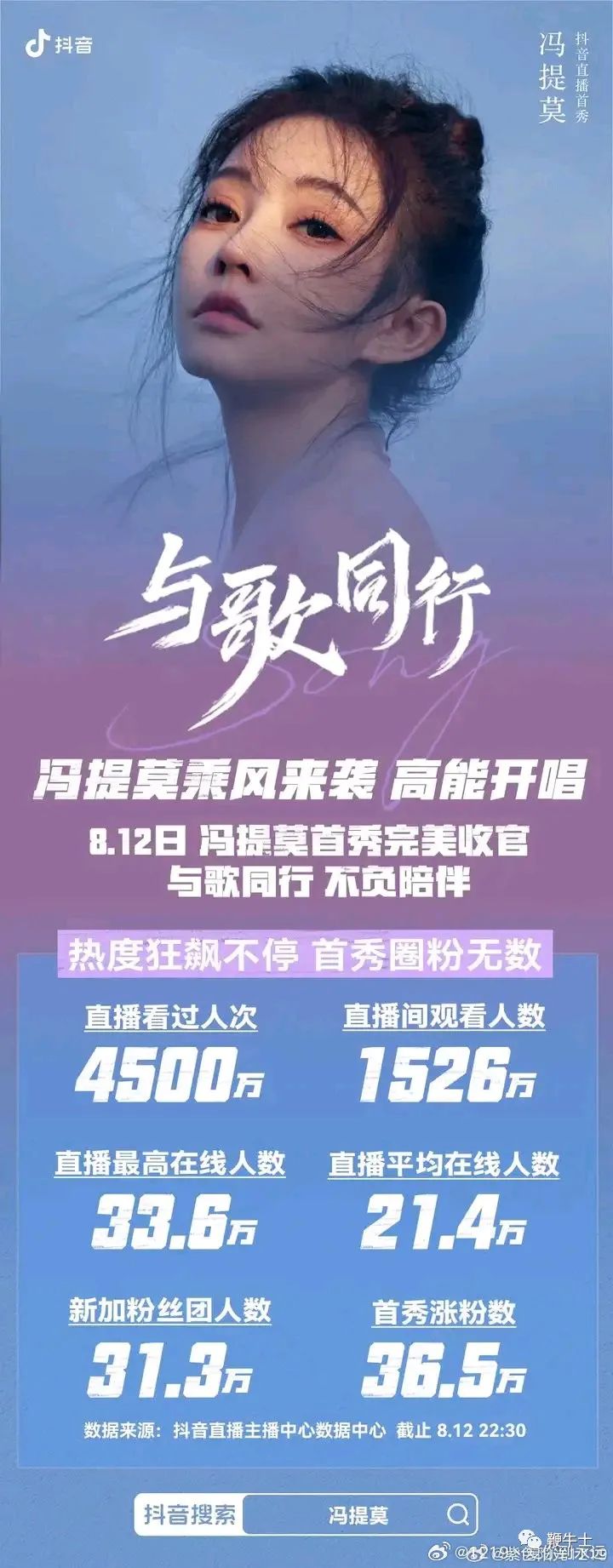 8月12日,因患甲状腺癌晚期接受治疗而停播半年的冯提莫,在抖音的直播首秀引发大范围的关注。