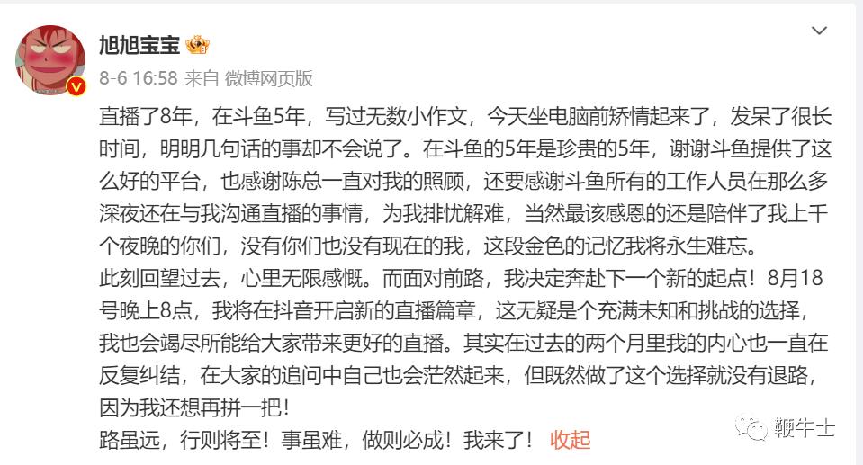 8月6日下午,旭旭宝宝在微博上宣布,与斗鱼的5年合约结束,将在8月18日前往抖音开启新的直播篇章。随后「旭旭宝宝签约抖音」的消息登上微博热搜和抖音热榜。