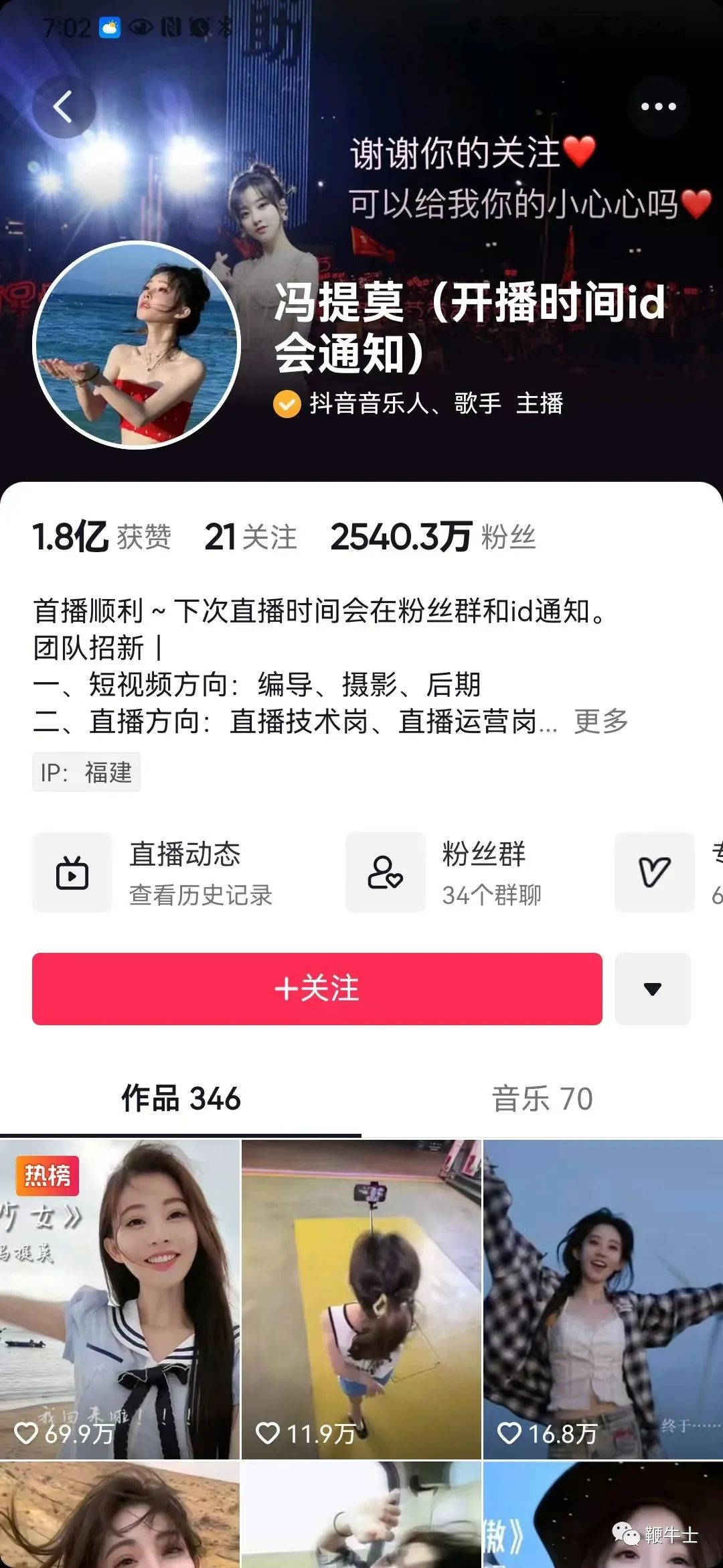 目前其抖音账号认证为抖音音乐人、歌手、主播,粉丝数为2540万。首秀结束后冯提莫并没有预告下次直播的具体时间,但在其主页发出了团队招新的通知,招募短视频方向、直播方向的工作人员,可见接下来冯提莫要专心在抖音发展的决心。